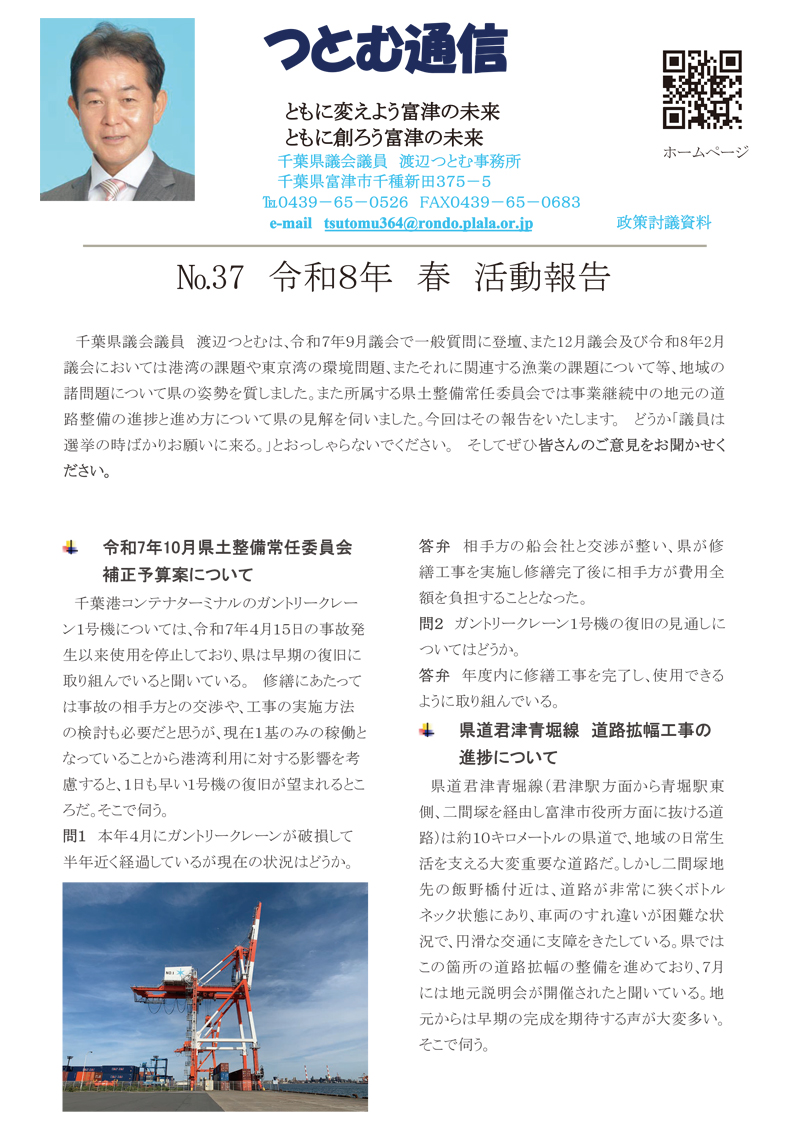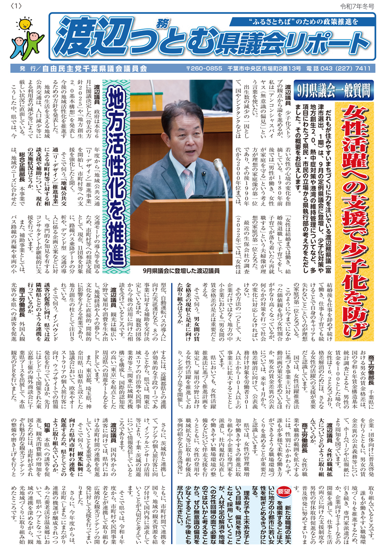 令和5年4月の統一地方選挙富津市選挙区にて新たに千葉県議会議員を拝命いたしました、渡辺つとむです。
